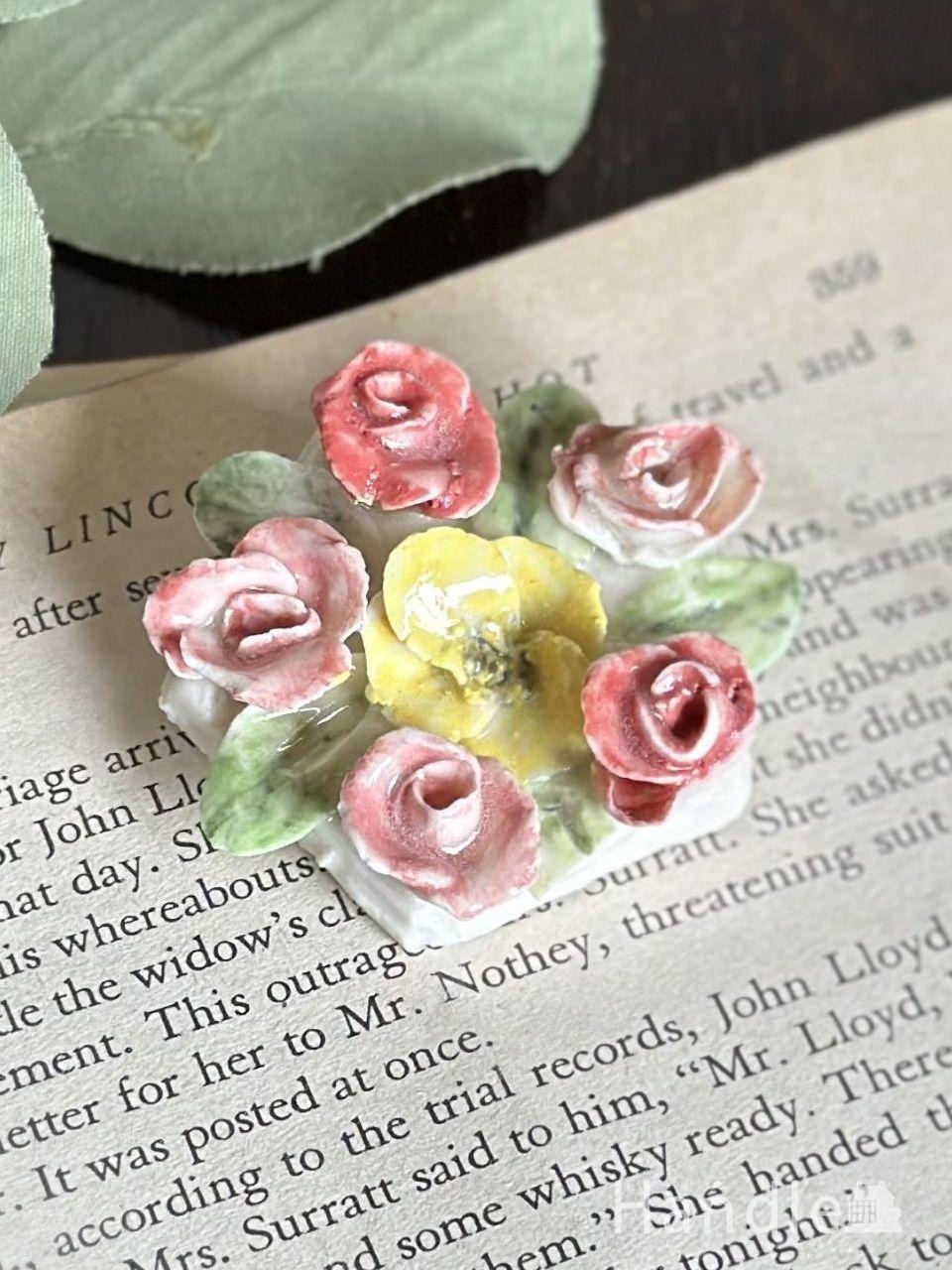陶器でできたピンク色のバラが可愛い、アンティーク陶花のブローチです。