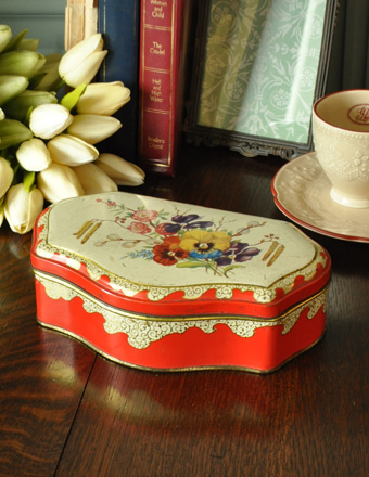 レトロな色使いがオシャレなティン缶です。