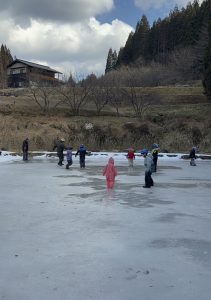 氷も溶けてなくなっているのでは・・と心配をよそに、しっかり氷が張られていて3歳の娘も長靴でスケートを楽しむことができました。